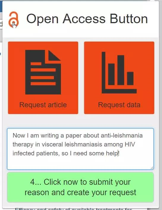 Open Access Button还是一款Chrome浏览器插件,安装注册后即可使用。检索文献时,需手动点击该按钮“Request article”,识别成功后可提供全文链接,如果没有检索到全文资源,可以向原文作者索要文献,需要填写一段理由或说明。除提供检索文献以外,Open Access Button还可以检索论文发表过程中使用的数据,获取方式同文献检索。另外,Open Access Button还提供直接的网页版检索文献功能。